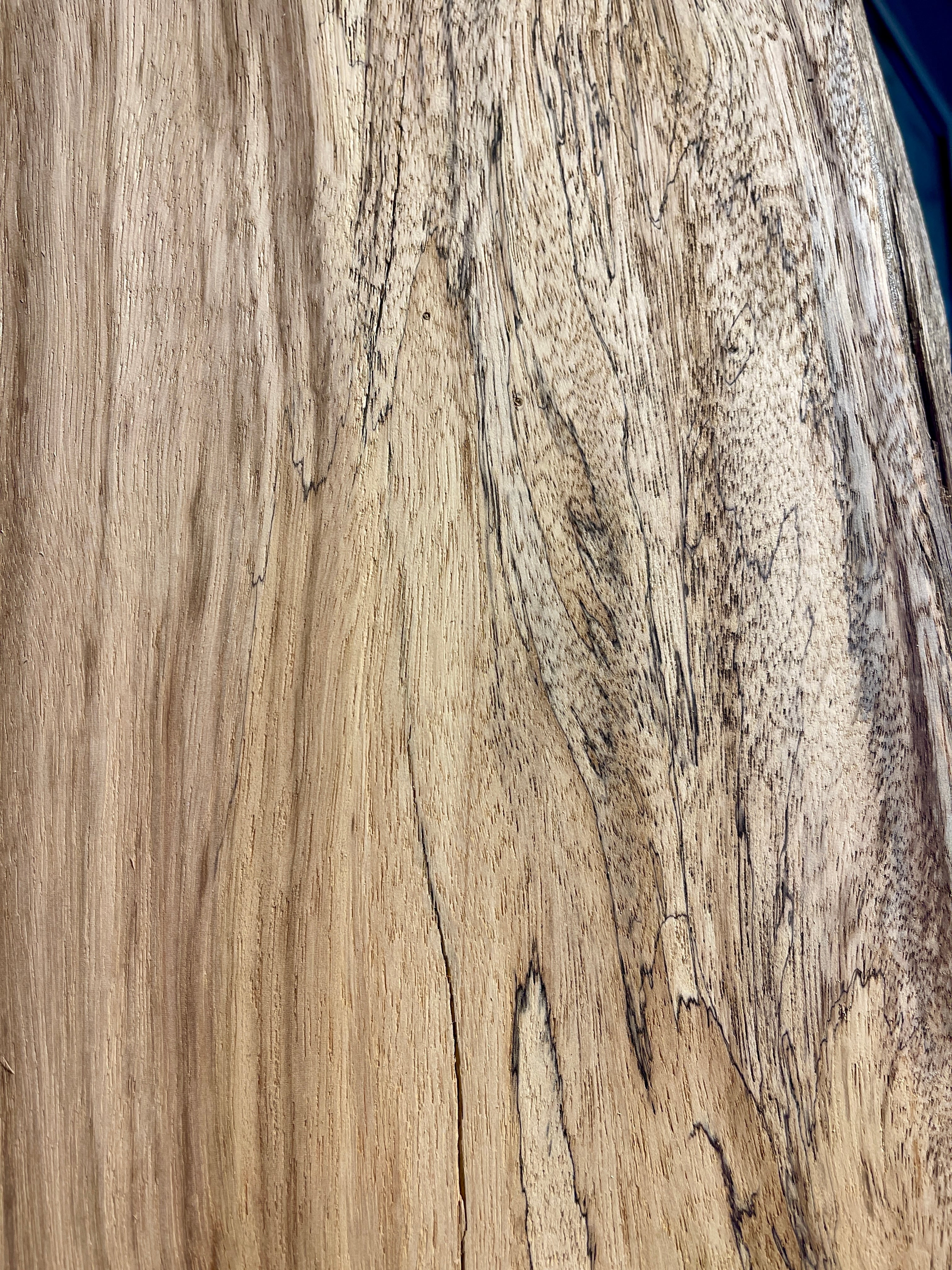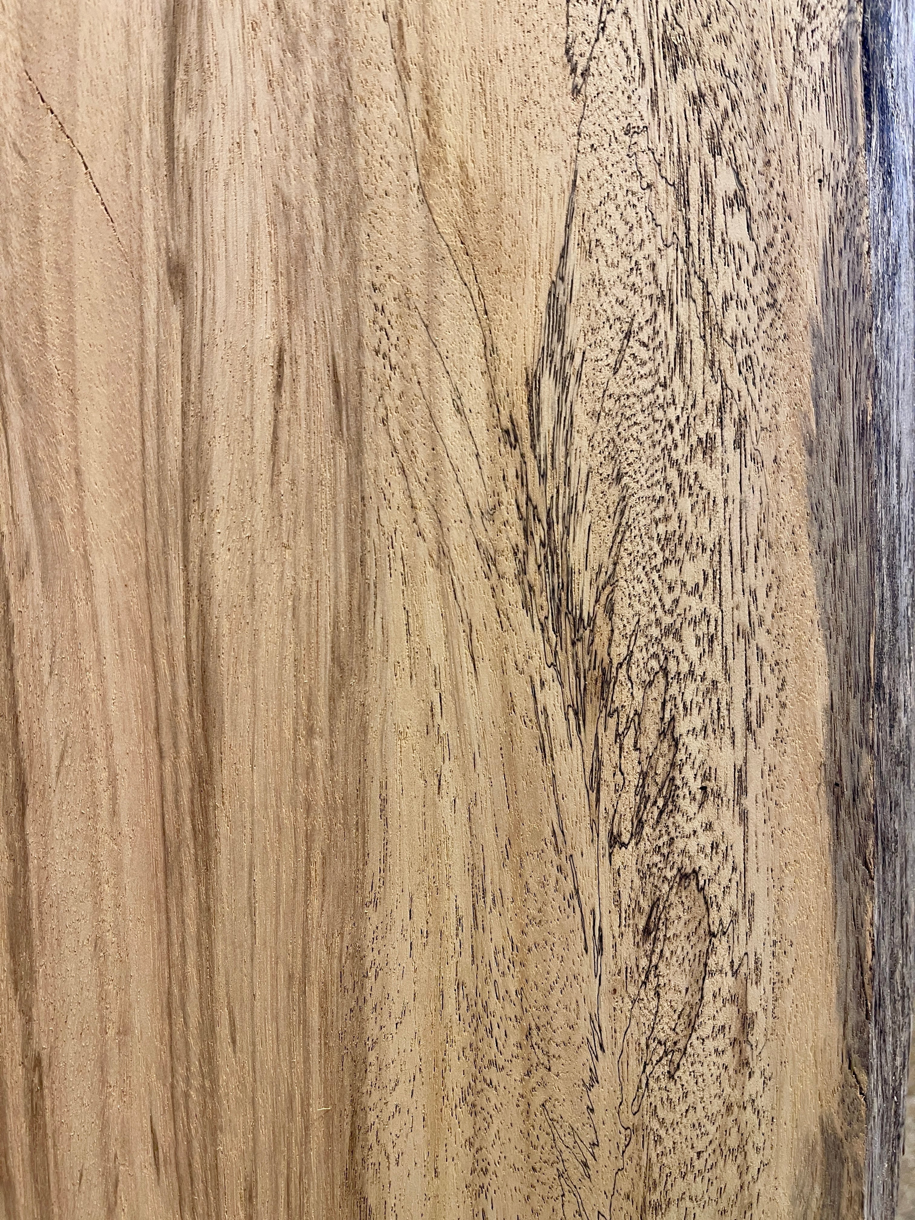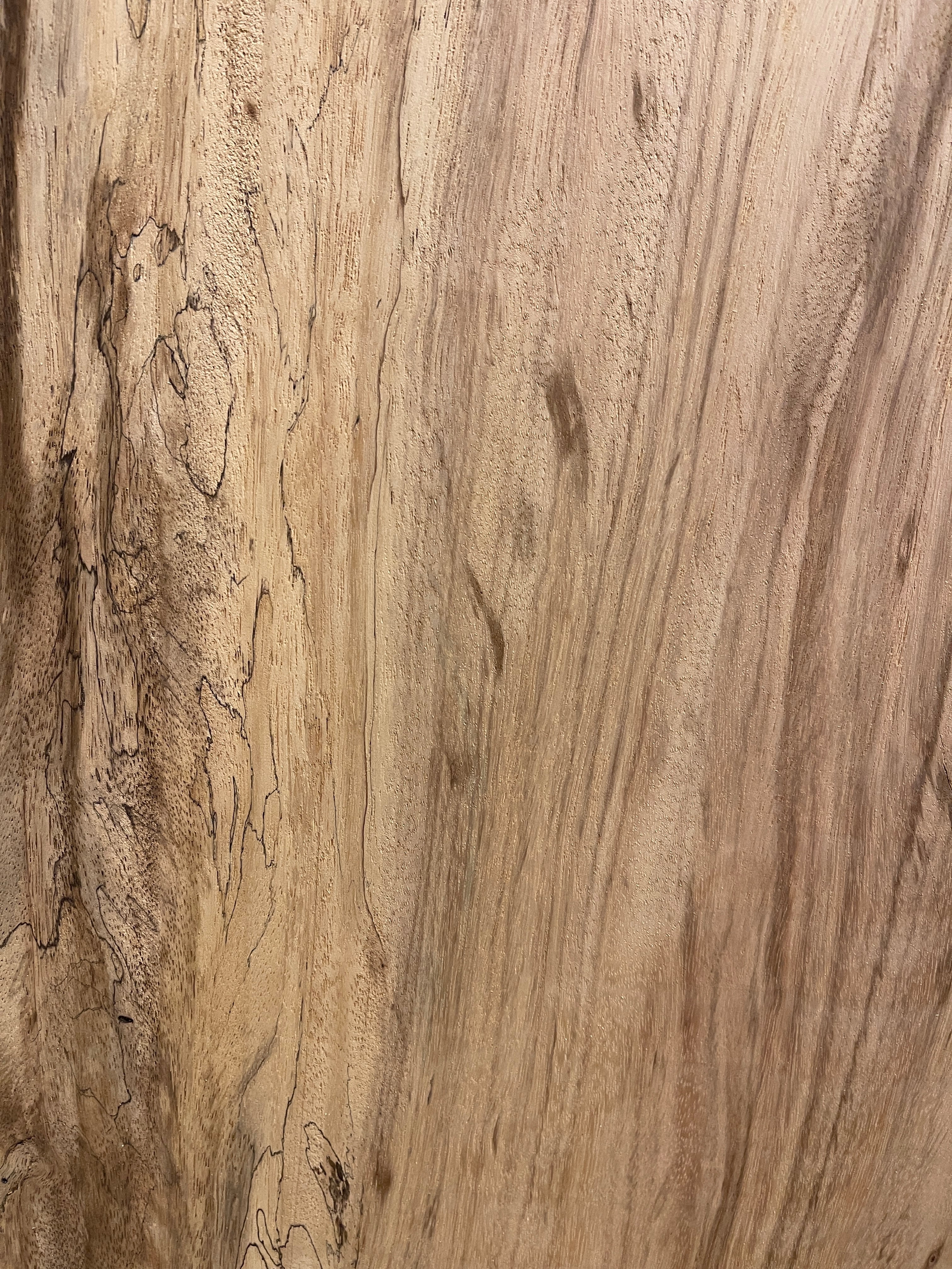 扇状に綺麗に流れる杢目と自然のアート、スポルテッドのコントラストは一枚板でしか味わえない一枚です。